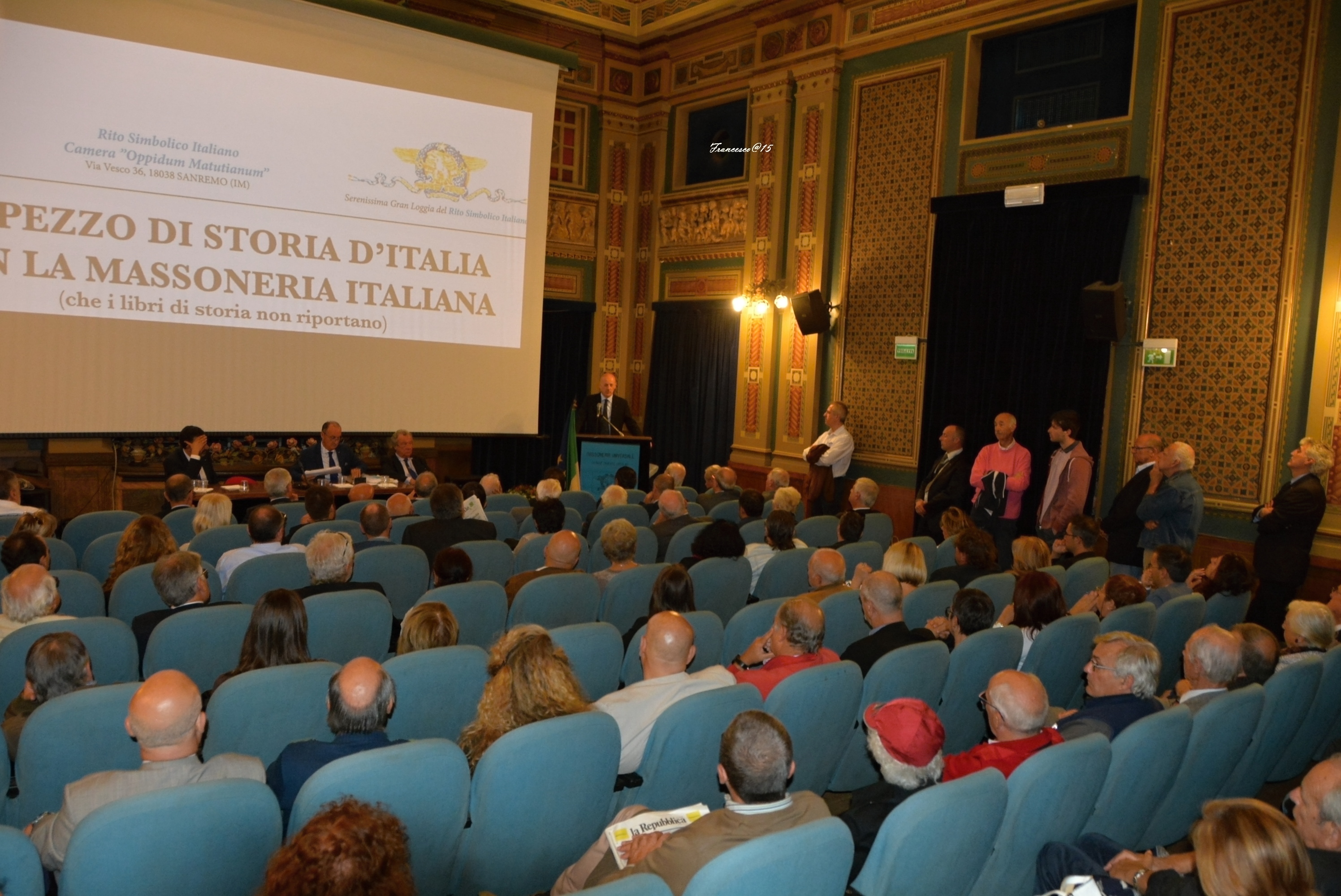 “Un pezzo di storia d’Italia con la Massoneria italiana (che i libri di storia non riportano)” è il tema che è stato al centro dell’incontro che si è tenuto domenica 11 ottobre nella “Sala Tabarin” del Cinema Centrale (Via Giacomo Matteotti 107) di Sanremo, a cura della Camera “Oppidum Matutianum” del Rito Simbolico Italiano. Un incontro, al quale hanno preso parte il Gran Maestro del Grande Oriente d’Italia Stefano Bisi e il Gran Maestro Aggiunto Santi Fedele, e che ha riscosso un enorme successo di pubblico, che , anche attraverso le domande che sono state rivolte ai relatori, ha espresso forte interesse sulla Libera Muratoria e sul ruolo che ha avuto nella crescita del nostro paese attraverso l’impegno sociale e culturale dei suoi esponenti. Un’occasione per spazzar via vecchi luoghi comuni, generati da disinformazione e pregiudizio. “Se ci conosci non ci eviti”, ha ribadito con una battuta il Gran Maestro, spiegando che il Goi è un’istituzione al passo con i tempi, trasparente, aperta alla società e vicina alle fasce più deboli. Di altissimo profilo anche l’intervento del professor Fedele, ordinario di Storia Contemporanea all’Università di Messina, che ha raccontato “Come nasce il primo Grande Oriente Italiano” . Poi ha preso la parola l’avvocato Giovanni Cecconi, presidente del Rito Simbolico Italiano, che ha illustrato il contributo delle Logge di Rito Simbolico.